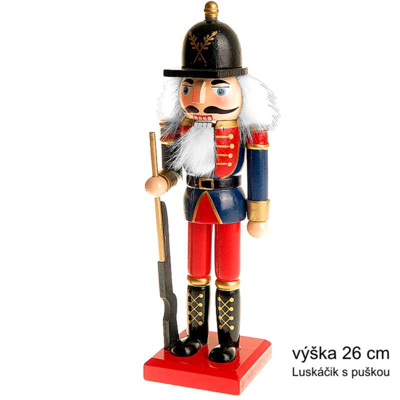 špecifikácia: maľovaný drevený luskáčik v podobe vojaka v historickej uniforme s puškou v ruke, je zmenšenou kópiou pôvodných krušnohorských luskáčikov na orechy, tieto očarujúce drevené luskáčiky na orechy majú svoj pôvod v nemeckých Krušných horách, kedy sa obyvatelia za dlhých zimných večerov venovali ich výrobe