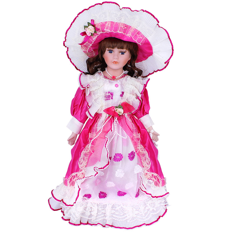 Popis: Okúzľujúca princezná s dlhými gaštanovými vlasmi je oblečená v bohato riasených ružových šatách zo saténu a silonu, ozdobených volánmi, čipkami a našitými flitrami a perličkami. Okolo krku má náhrdelník. Na hlave má veľký klobúk vo farbe šiat. Hlava, ruky a nohy sú z porcelánu, telo je z mäkkého textilu.