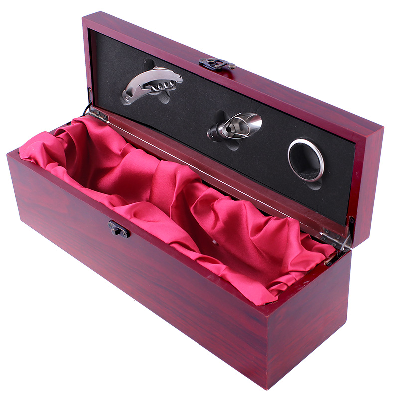 Elegantný darčekový drevený kufrík na fľašu alkoholu so sadou vinárskych pomôcok ako sú otvarák, nálievka a krúžok na hrdlo fľaše, truhlica sa zatvára na záklopku, vhodný darček pre mužov