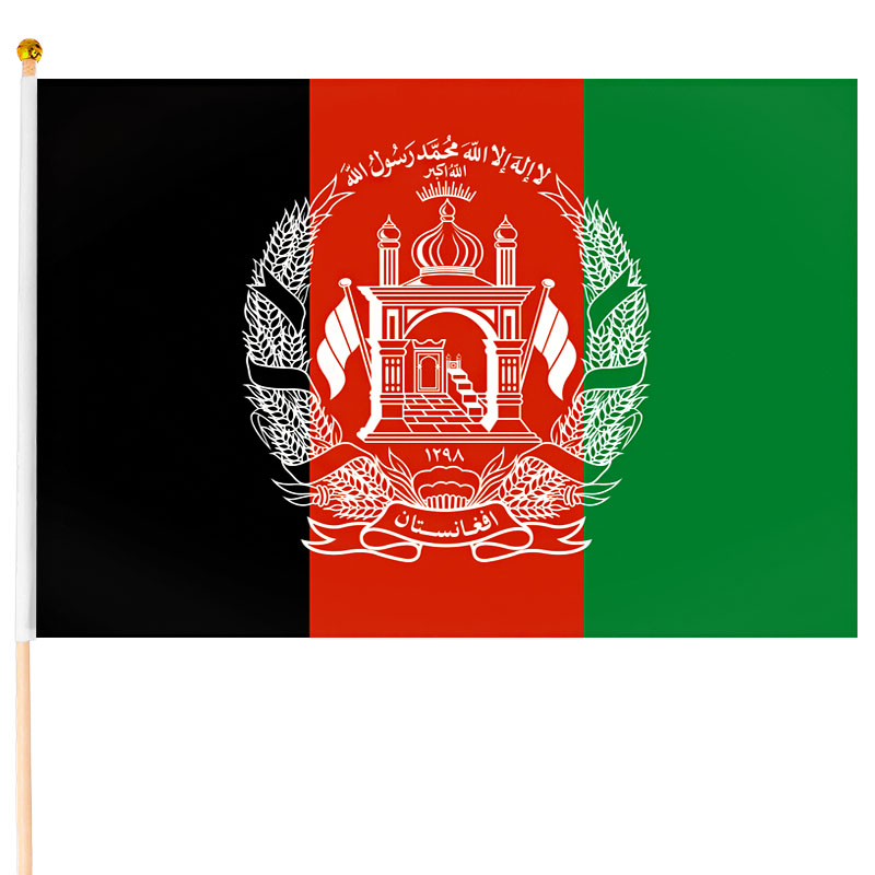 Vlajka je pripevnená na držadle dĺžky 61 cm, ktorá je vyrobená z dreva. Na výrobu vlajky bol použitý polyester. Vlajka je ideálna ako dekorácia do bytu, do podniku či ako symbol počas fandenia národnému tímu. Čierna farba na vlajke predstavuje jej problematickú históriu 19. storočia ako protektorátu, červená farba predstavuje krv tých, ktorí bojovali za nezávislosť (konkrétne Anglo-afganská zmluva z roku 1919) a zelená predstavuje nádej a prosperitu do budúcnosti.