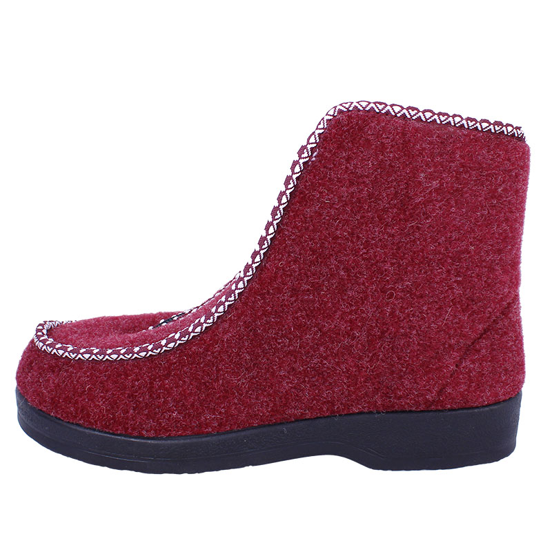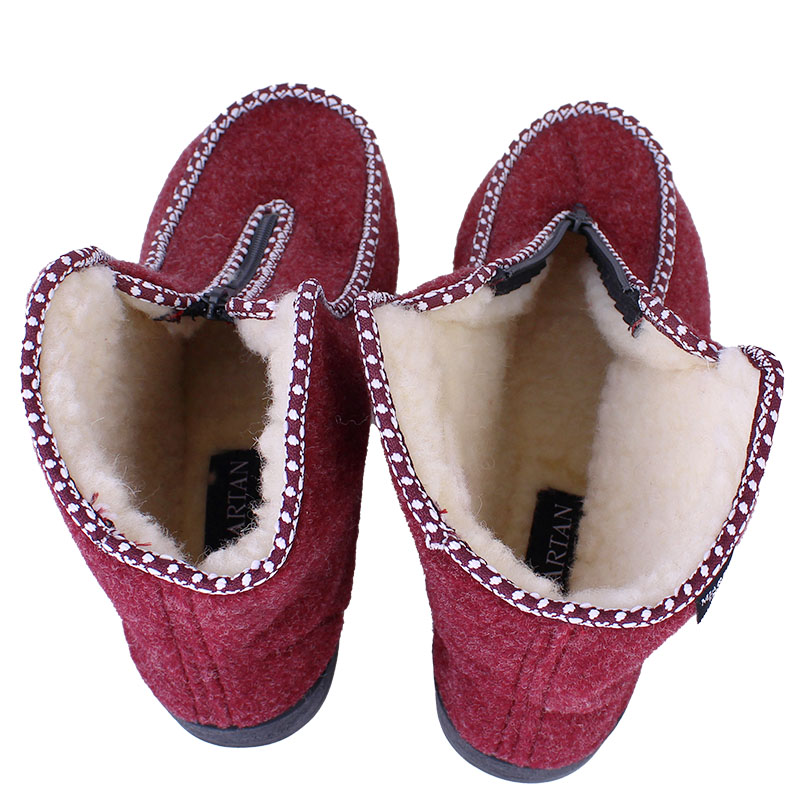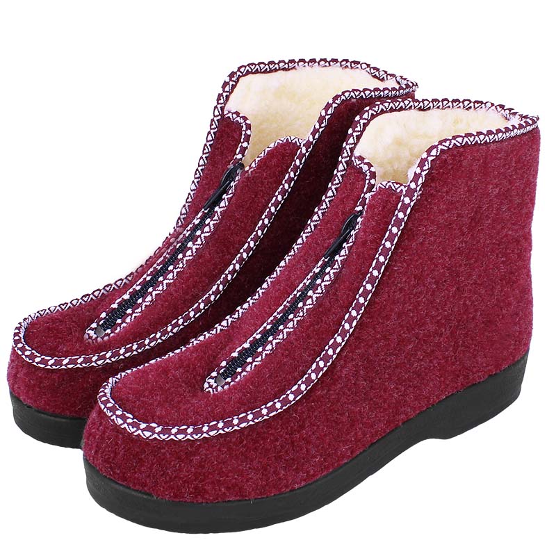 špecifikácia: členkové filcové papuče na zimu so zapínaním na umelohmotný zips, zdobené farebnou výšivkou, vo vnútornej časti zateplené textilnou kožušinkou, hrubšia klinová gumová podrážka