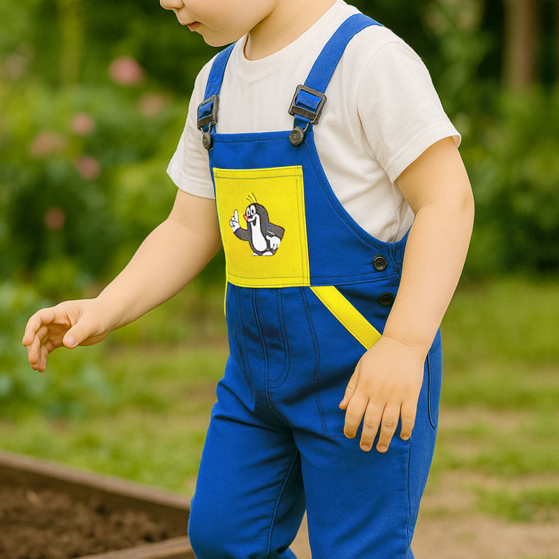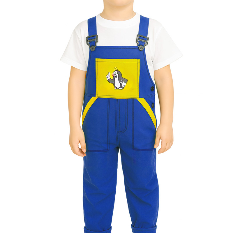 špecifikácia: praktické detské monterky na traky vhodné pre malých pomocníkov majstrov, záhradníkov, opravárov s obrázkom krtka na prednom diele, 2x predné vrecko, 1x zadné vrecko, 1x náprsenkové vrecko, vrecká sú zvýraznené žltým lemom, v zadnej časti pásu sťahovacia guma, detské nohavice v dobrej cene
