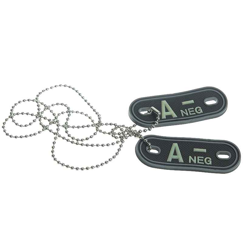 špecifikácia: súprava dvoch gumených identifikačných príveskov na krk s kratšou a dlhšou retiazkou, na ktorých je fosforeskujúca luminiscenčná 3D tlač s označením krvnej skupiny A - NEG, známky, odznaky alebo nášivky či iné informácie s označením krvnej skupiny pre každého, kto pracuje v nebezpečnom prostredí, ako sú šoféri, cyklisti, športovci z army shopu nitra TifanTEX
