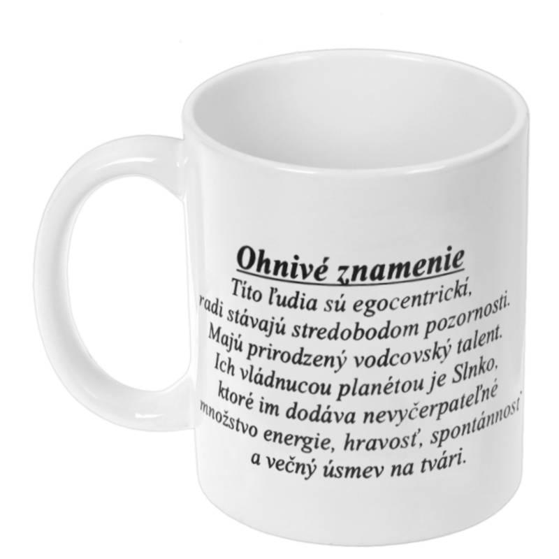Hrnček s potlačou znamenia Lev je ideálny darček pre každého človeka v znamení Lev. Hrnček s celkovým objemom cca 0,33L bol vyrobený z klasickej bielej keramiky. Vpredu na šálke sa nachádza trefný motív, ktorý vyobrazuje znamenie Leva a druhej strane je vypísaný krátky opis tohto znamenia. Ideálna potlač na hrnčeku dokáže vytvoriť veľmi osobný predmet. Na šálkach býva častokrát vyobrazená ľudská vlastnosť, meno, alebo hobby, čo z nich vytvára vynikajúci darček pre muža i ženu.