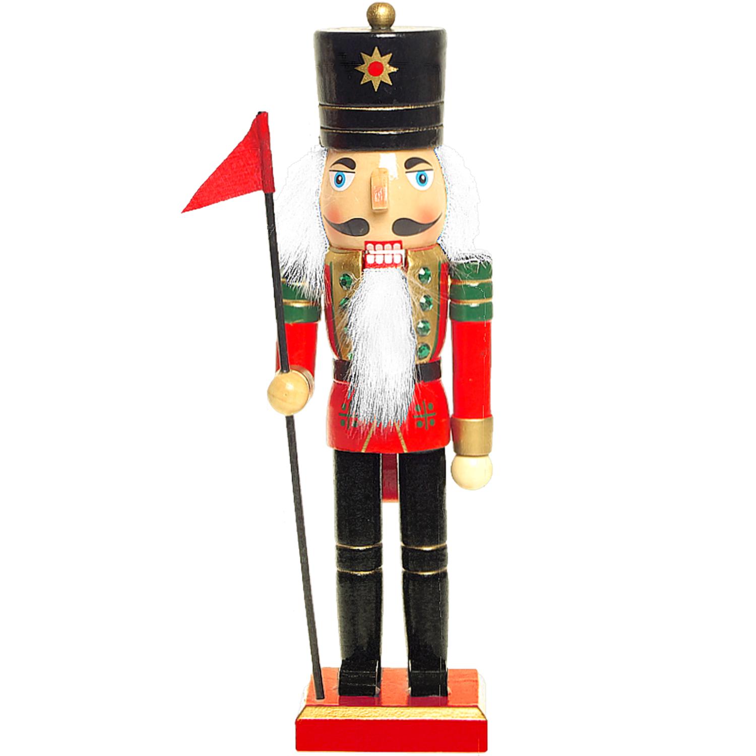 Maľovaný drevený Luskáčik kráľ so zástavou v uniforme 26 cm je ideálna vianočná dekorácia do bytu. Luskáčik oblečený ako vojačik so zástavou zvýrazní atmosféru najkrajších sviatkov a je vhodný aj ako darček. Pôvodný luskáčik Nussknacker mal podobu kráľa, vojaka, baníka alebo lesníka v rôznych uniformách a veľkostiach, ktoré niekedy presahovali aj pol metra a slúžil na rozbíjanie vlašských orechov.