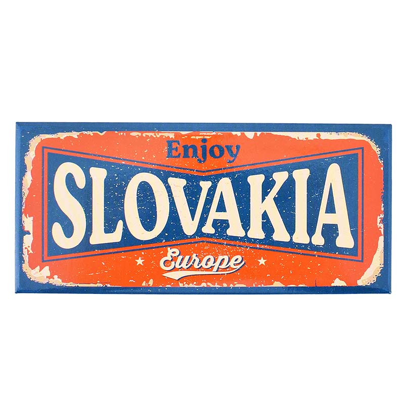 Magnetka v retro prevedení s nápisom Slovakia, ktorá je vhodná ako slovenský suvenír, dekorácia do bytu či domu alebo ako ďalšia magnetka na chladničku.