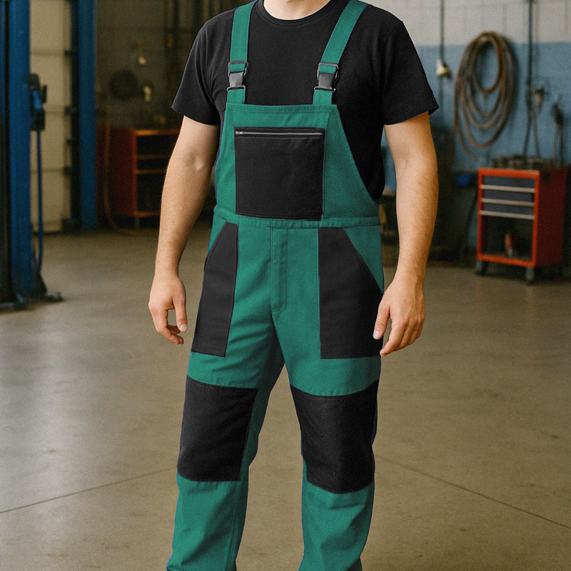 špecifikácia: pánske bavlnené pracovné montérky na traky s náprsenkou, s vreckami, zosilnením na kolenách, bočné zapínanie na gombíky, jedno bočné vrecko, dve predné vrecká, jedno náprsenkové vrecko so zipsom, jedno zadné vrecko a spevnené kolená sú čiernej farby, v páse vzadu guma, nastavenie dĺžky pomocou trakov