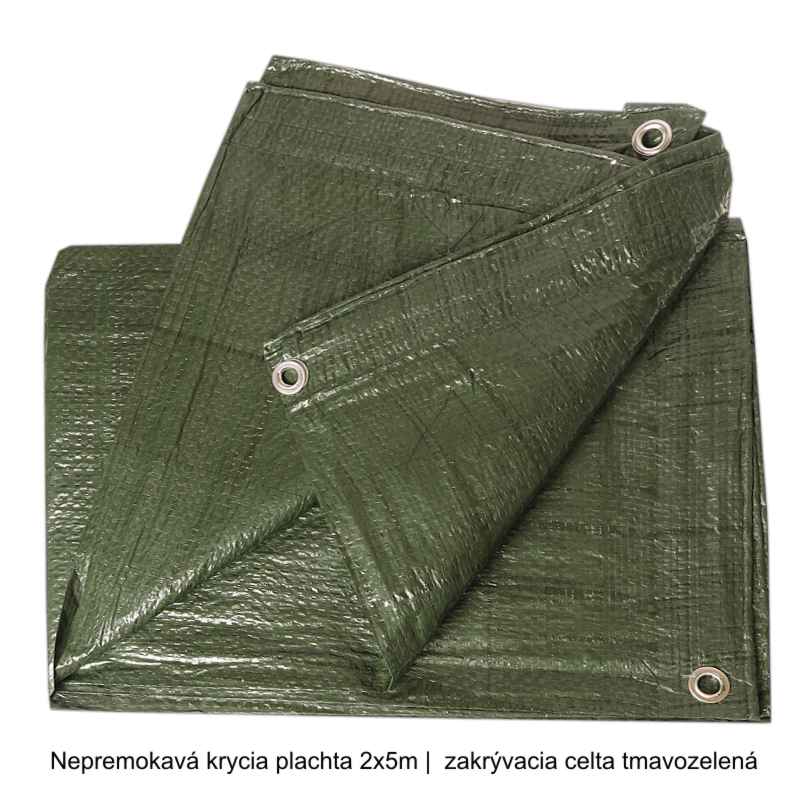 špecifikácia: tmavo zelená krycia plachta o rozmeroch 2 x 5 m z nepremokavého materiálu má po obvode spevnené zažehlené okraje, po obvode plachty je všitý povraz