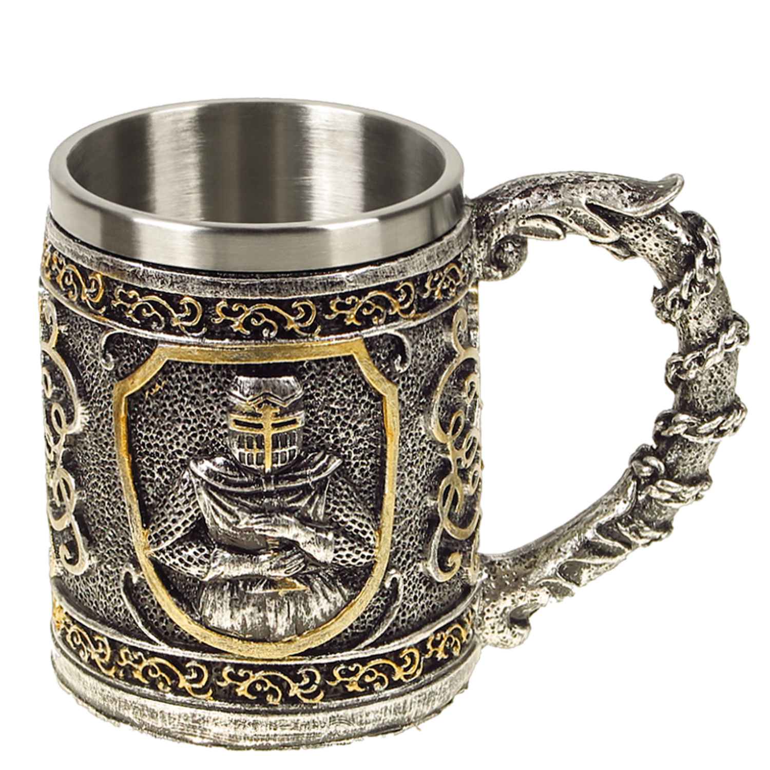 Tento nerezový pohár na víno, pivo či akékoľvek iné nápoje s objemom 0,4L zaujme každého milovníka doby rytierov. Pohár v rytierskom prevedení vie byť aj bytová dekorácia či darček pre muža. Vonkajší povrch je vyrobený z tvrdeného plastu. Vnútro pohára je vyhotovené z nehrdzavejúcej oceli, takže je ideálne pre všetky typy nápojov.