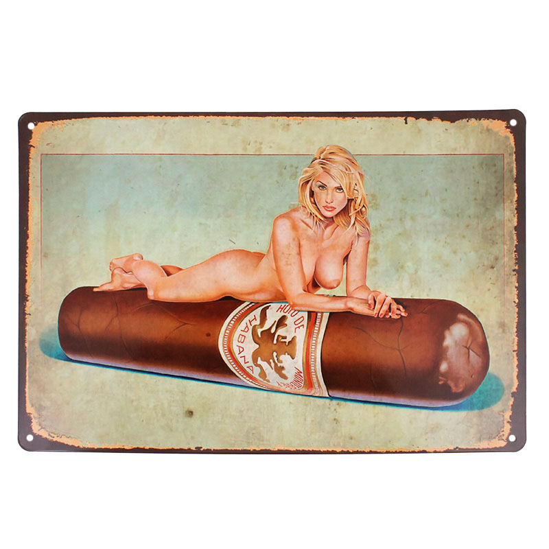 Kovová ceduľa v retro vyhotovení s dizajnom atraktívnej ženy a cigary. Výborná dekorácia do bytu pre ľudí, ktorí obľubujú dekorácie v retro štýle. Ceduľka je vyrobená z plechu s potlačou a štyrmi dierami na rohoch, vďaka čomu je možné ju zavesiť na stenu. Rozmery cedule sú 30 x 15 cm.