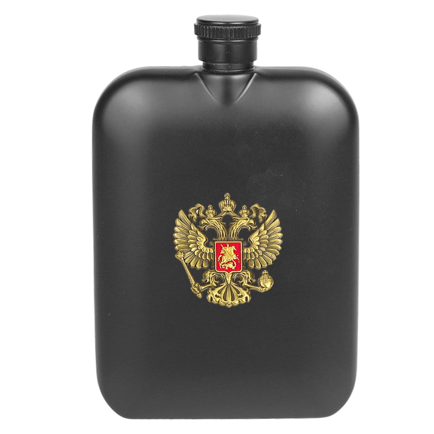 Elegantná nerezová ploskačka s ruským znakom, ktorá vám umožní vychutnať si kvalitný destilát takmer kdekoľvek, a to vďaka jej praktickým rozmerom ideálnym do vrecka bundy či nohavíc. Ploskačka bola vyhotovená z nehrdzavejúcej ocele pokrytej v čiernej matnej farbe, ktorá dodáva ploskačke jej moderný, luxusný vzhľad. Po dizajnovej stránke je doplnená aj o ruský národný znak v zlatej farbe s rozmermi 3,2 x 3,5 cm. Objem ploskačky cca 180 ml (6 oz) zaručuje dostatok miesta pre vašu obľúbenú liehovinu. Vezmite si túto elegantnú ploskačku so sebou na výlet, alebo ju využite ako darček pre muža či ženu - priaznivca Ruska.