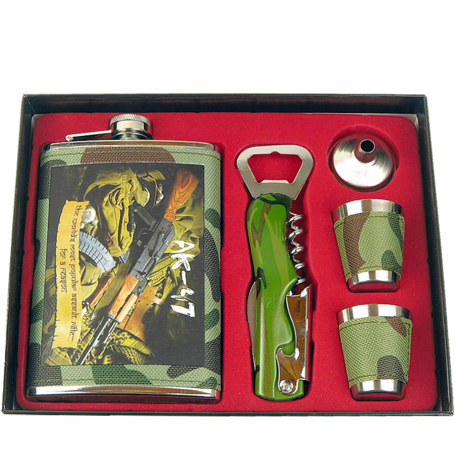 špecifikácia: veľmi pekná nerezová ploskačka s vyobrazením ruského samopalu Kalašnikov AK47na maskáčovom podklade, 2 nerezové poháriky sú obalené v maskáčovom textile, dodáva sa v kazetovom darčekovom balení, múže byť vhodný a praktický darček pre muža, či zberateľa ruských suvenírov, kazeta obsahuje ploskačku s poistným uzáverom, dva malé nerezové poháriky, lievik a multi otvárač na fľaše, ktorého súčasťou je vývrtka a nožík