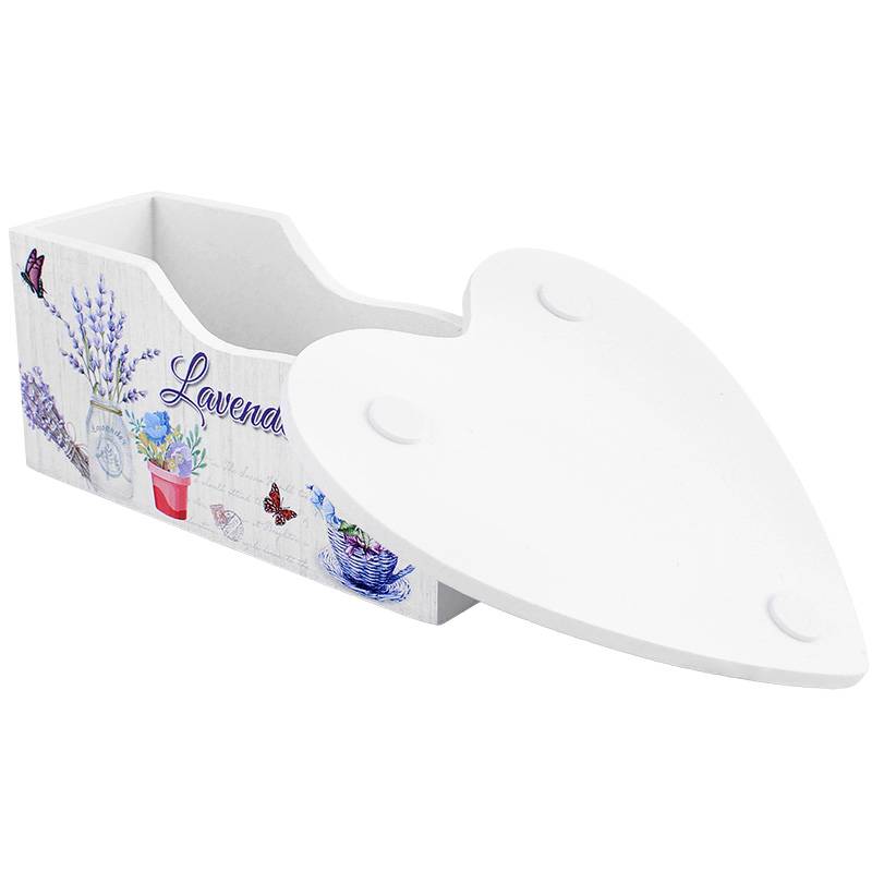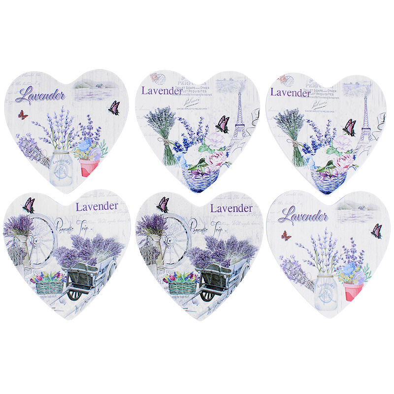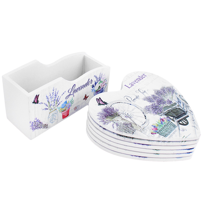 Oživte v sebe provensálsky štýl s týmito krásnymi podložkami pod poháre v tvare srdiečka. Tieto drevené podložky prichádzajú v balení so 6 kusmi, z ktorých každý sa môže pýšiť rozličným prevedením. Najčastejšie sa na podložkách vyskytuje kytica levandule, ako aj ostatné vizuálne prvky na pozadí z bieleho dreva, pre ktoré je typický práve vintage štýl. Na spodku podložiek sa nachádzajú penové nožičky, ktoré zabezpečujú zvýšené trenie po stole, ktoré je kľúčové pre vyššiu stabilitu podložiek, a teda aj pohára či šálky. Podložky prichádzajú so zladeným dreveným stojanom pre ľahšie skladovanie, vyberanie a zorganizovanie podložiek. Tieto skvelé vintage doplnky do kuchyne s motívom provensálskeho štýlu levandule prekvapia svojim vkusným prevedením všetkých hostí, rodinných príslušníkov a známych svojim príjemným dizajnom prispôsobeným na vintage a retro štýl.