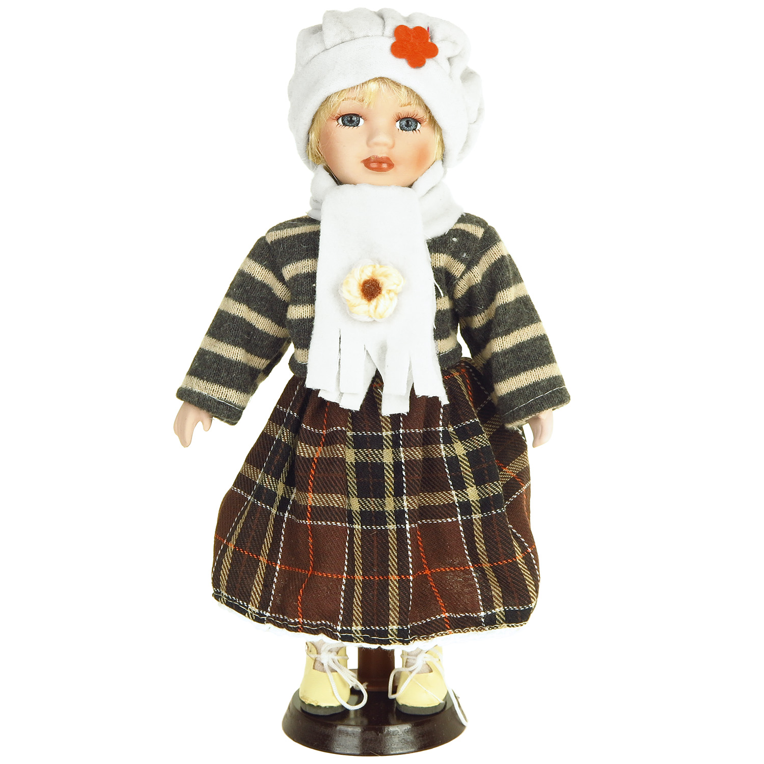 Milá bábika bola vyrobená z porcelánu, je vysoká 33 cm, má blond vlasy a je oblečená do jesenného oblečenia.