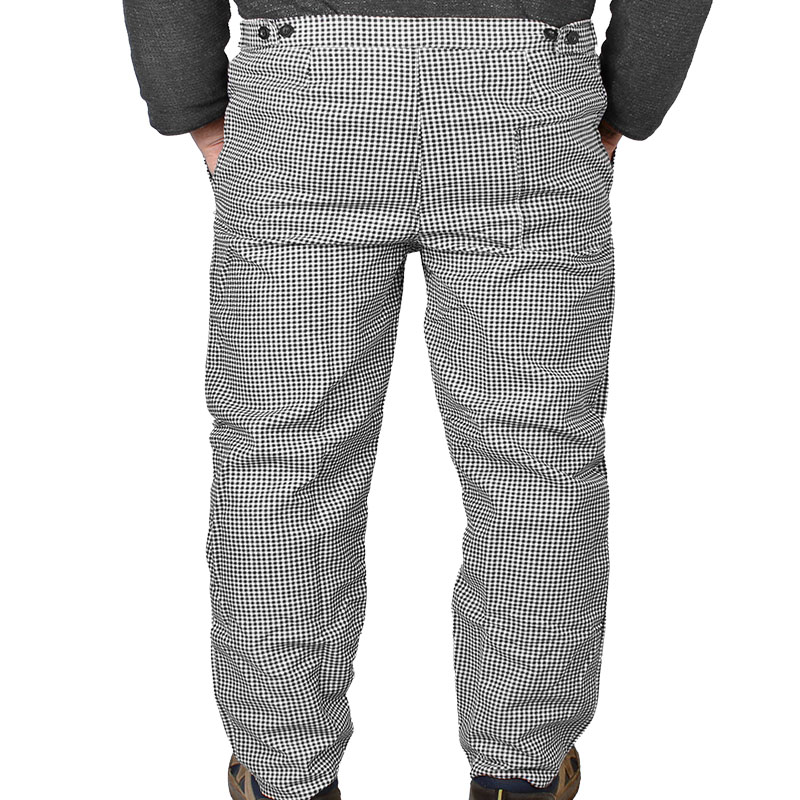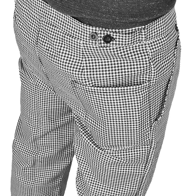 Klasické pracovné nohavice do pása pre mužov. Na týchto pánskych montérkových nohaviciach sa nachádzajú dve predné vrecká a jedno zadné vrecko. Pás sa zapína pomocou gombíku. Na výrobu bola použitá 100% bavlna vyrobená do materiálu keper / monterkovina. Tieto pánske monterky pochádzajú zo slovenskej krajčírskej dieľne. Pánske montérkové nohavice so vzorom pepito ideálne pre kuchárov, kuchynský personál, mäsiarov, pracovníkov v potravinárskej výrobe a pod.