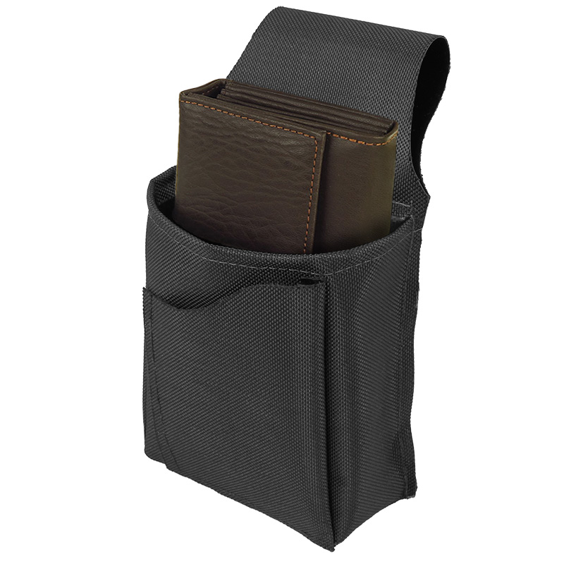 Čierne puzdro na čašnícku peňaženku vyrobené z nylonu. Vnútorné rozmery puzdra sú 10 x 5,5 x 14 cm. V prednej časti sa nachádza malá priehradka s rozmermi 7 x 10 cm pre doklady, papierové peniaze, mince, karty a pod. Na bočnej strane je zasa malé puzdro, do ktorého sa zmestí pero.