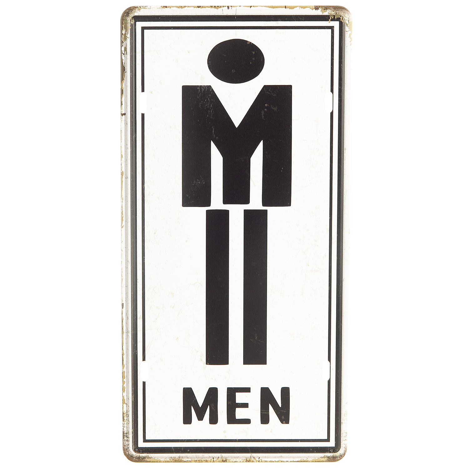 Kovová tabuľa v retro prevedení s nápisom Men v čiernobielom dizajne. Ide o zaujímavú dekoráciu do bytu pre ľudí, ktorí obľubujú retro dekorácie. Tabuľa bola vyhotovená z plechu so štyrmi dierkami pre umiestnenie na stenu. Rozmery cedule sú 30 x 15 cm (V x Š).