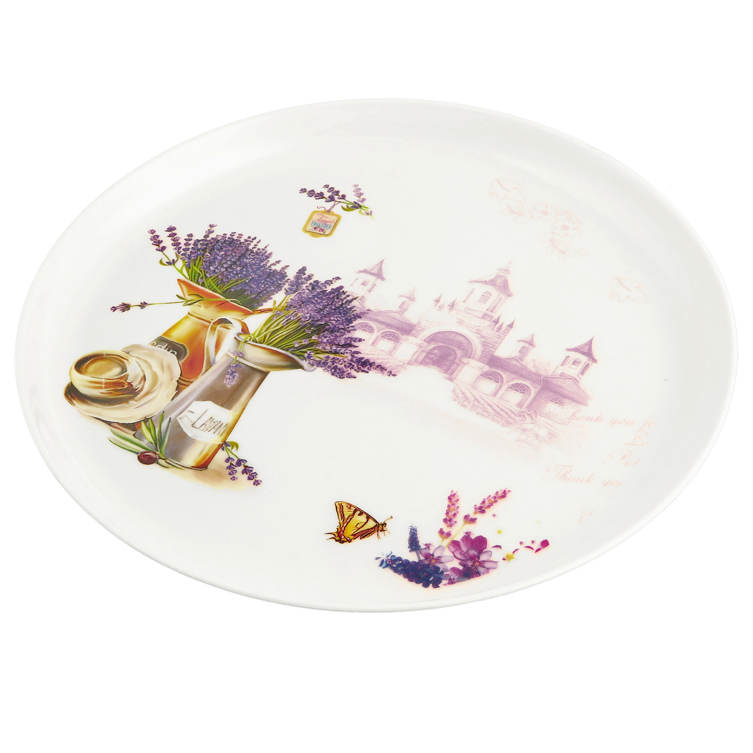 Tento elegantný podnos je vyrobený z odolného a ľahko umývateľného materiálu. Na povrchu sa nachádza milá potlač s tématikou levandule. Okrúhly podnos lavender je tvorený plochou s priemerom 30cm a vyvýšenými stenami o výške cca 2,5cm. Servírovací podnos s priemerom 29cm je vhodný na servírovanie kávy, čaju, nápojov, keksíkov a iného občerstvenia. Nesmie sa vkladať do umývačky riadu, ani do mikrovlnnej rúry.