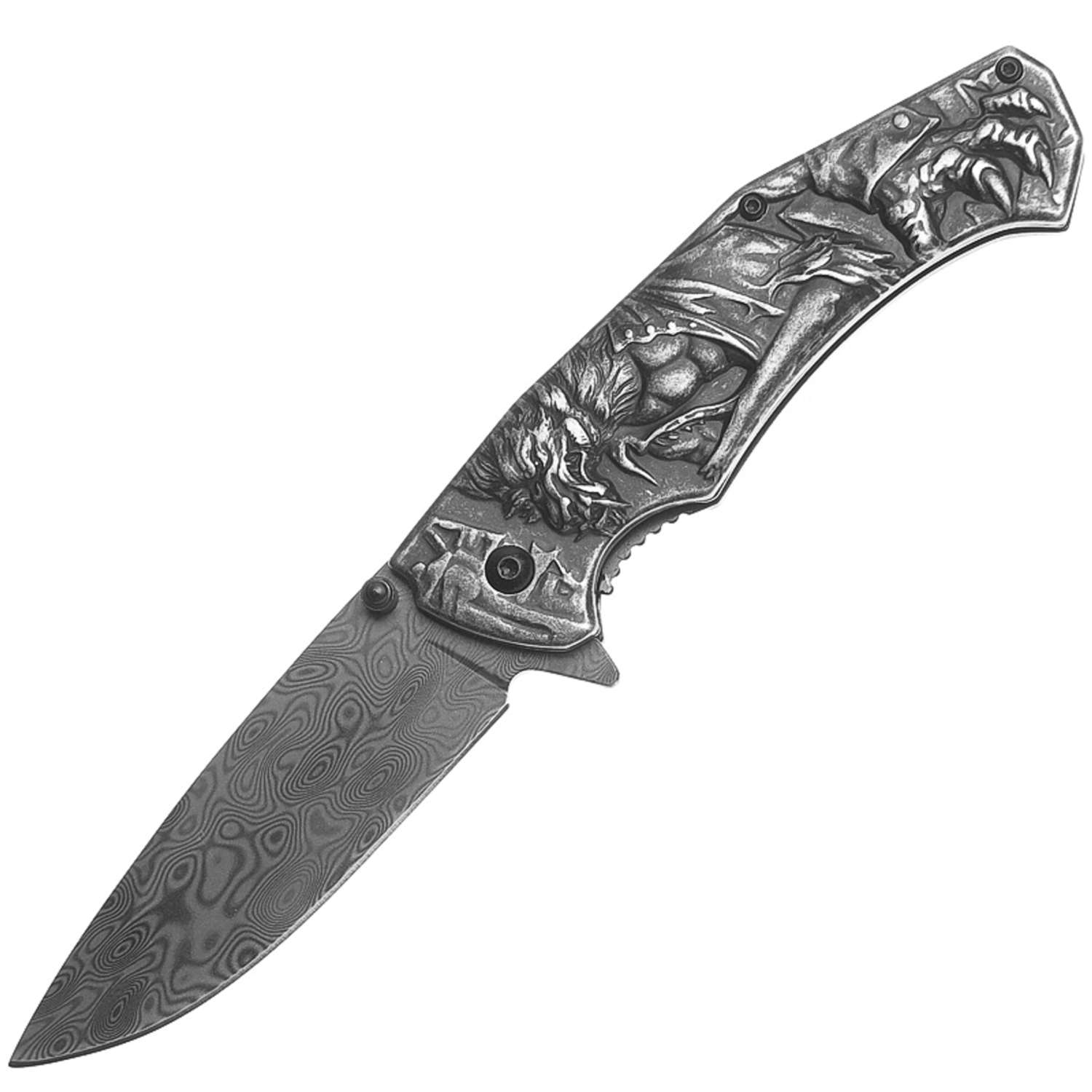 Šikovný vreckový nôžík so vzorom vlkodlaka na rukoväti, čepel je šedá. Vreckové nože sú vhodné kamkoľvek si zmyslíte, či už idete do prírody, lesa, na huby alebo len potrebujete niečo doma odrezať. Zo zadnej strany noža je spona pre uchytenie na opasok a podobne. Nôž obsahuje poistku proti samovoľnému zatvoreniu čepele.